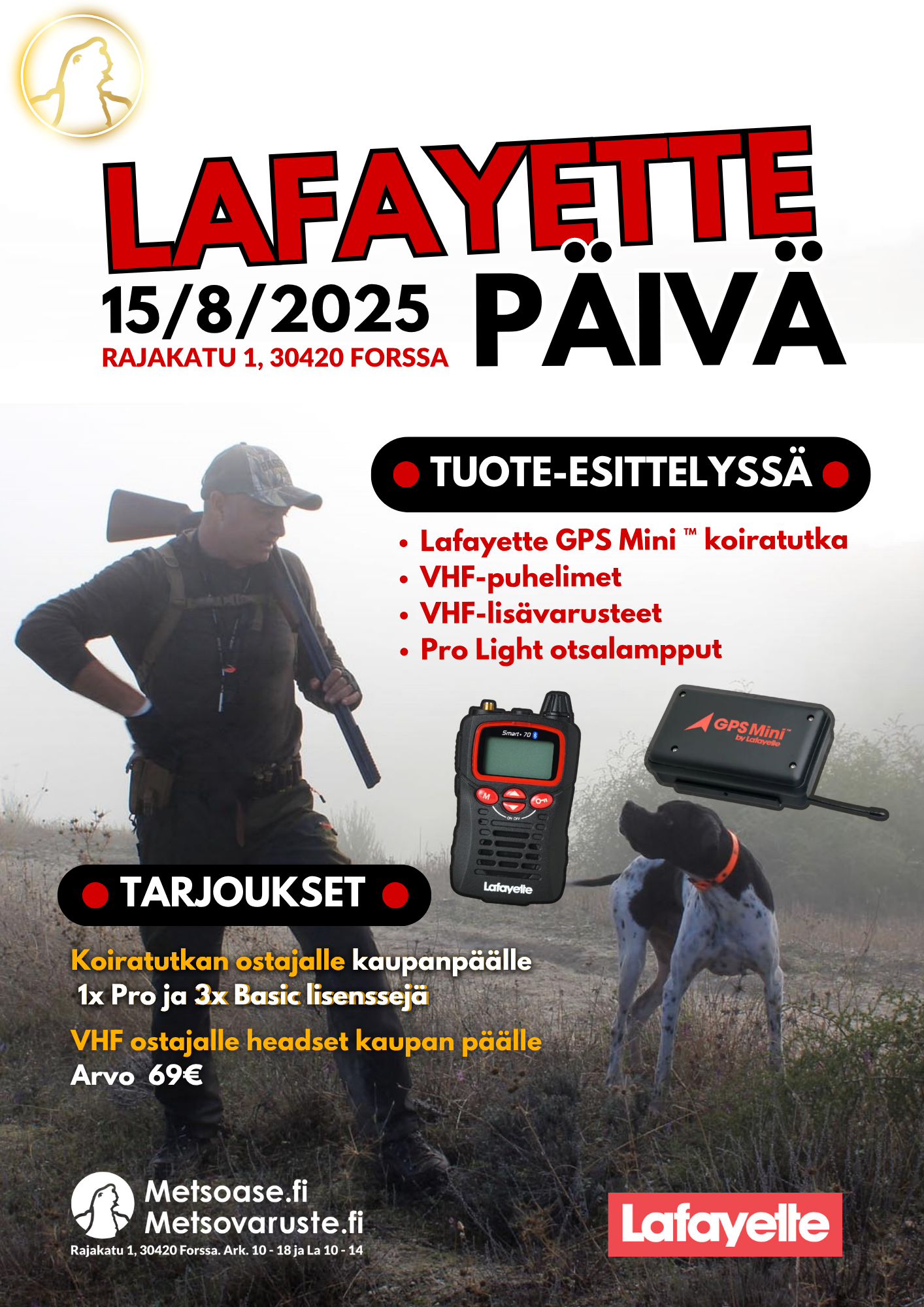 1.2.2024 ‐ 30.9.2024 välisenä aikana Lapua Naturalis ‐patruunoita kaksi rasiaa kertaostoksena, kotimaiselta jälleenmyyjältä, ostaneet kuluttajat osallistuvat arvontaan, jossa arvotaan kahdelle henkilölle jahtimatka Keski‐Eurooppaan.