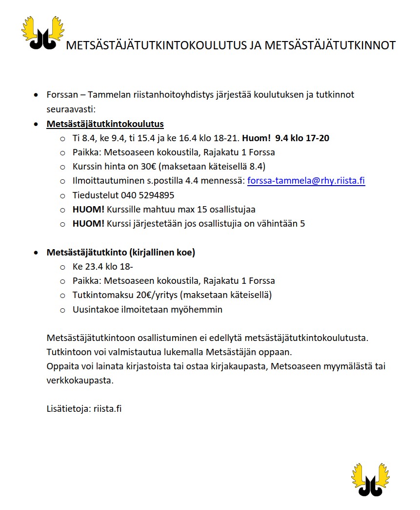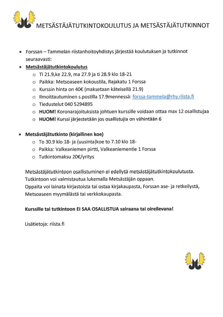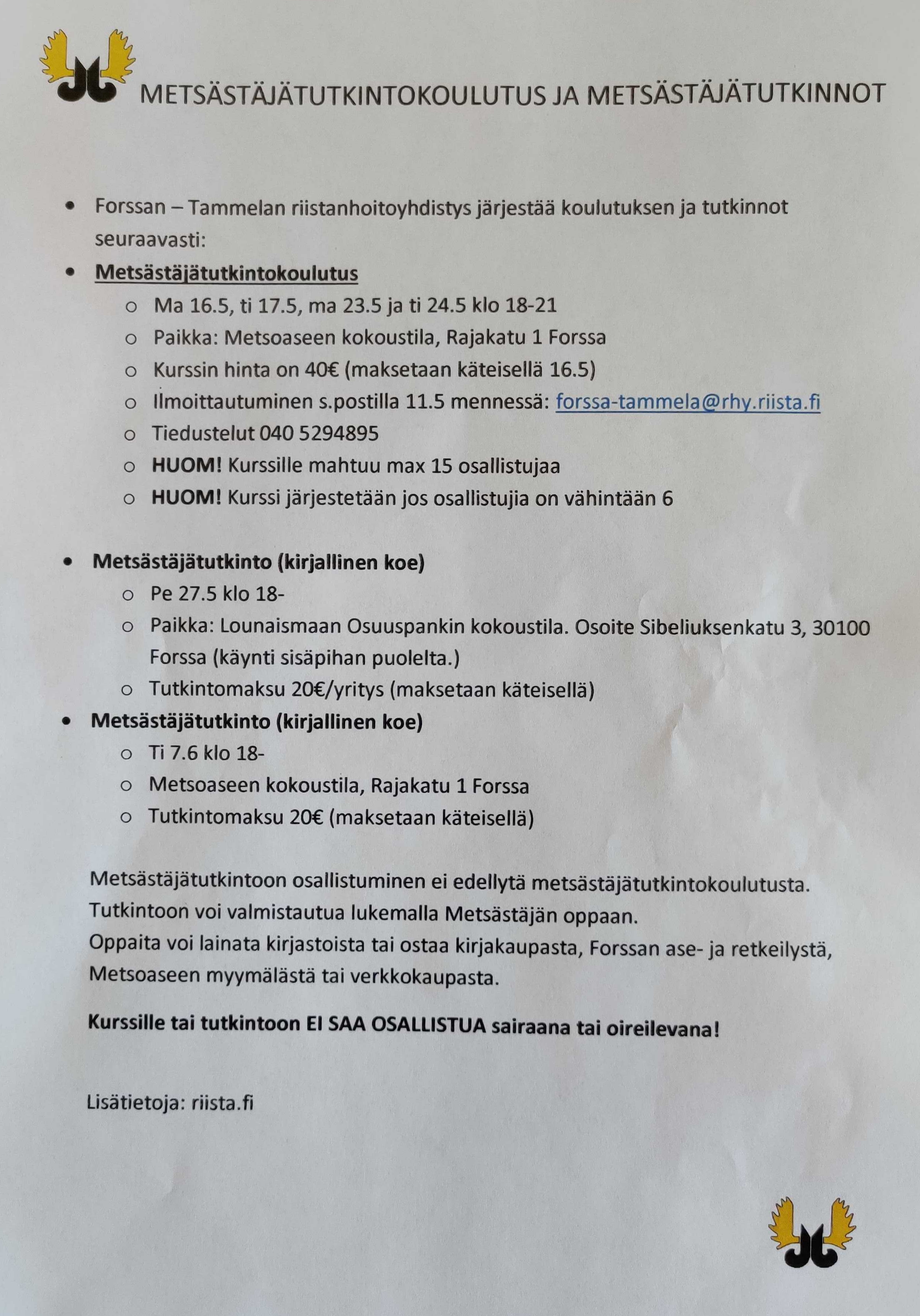 - Forssan – Tammelan riistanhoitoyhdistys järjestää koulutuksen ja tutkinnot seuraavasti: