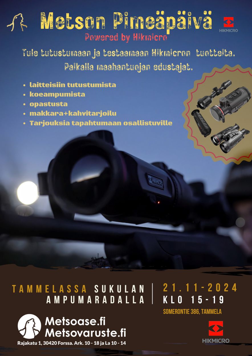 Järjestämme pimeänäkötapahtuman 21.11 Sukulan ampumaradalla. Klo15-19 välillä mahdollisuus tutusta ja testata hikmicro tuotteita myös koeampumalla.