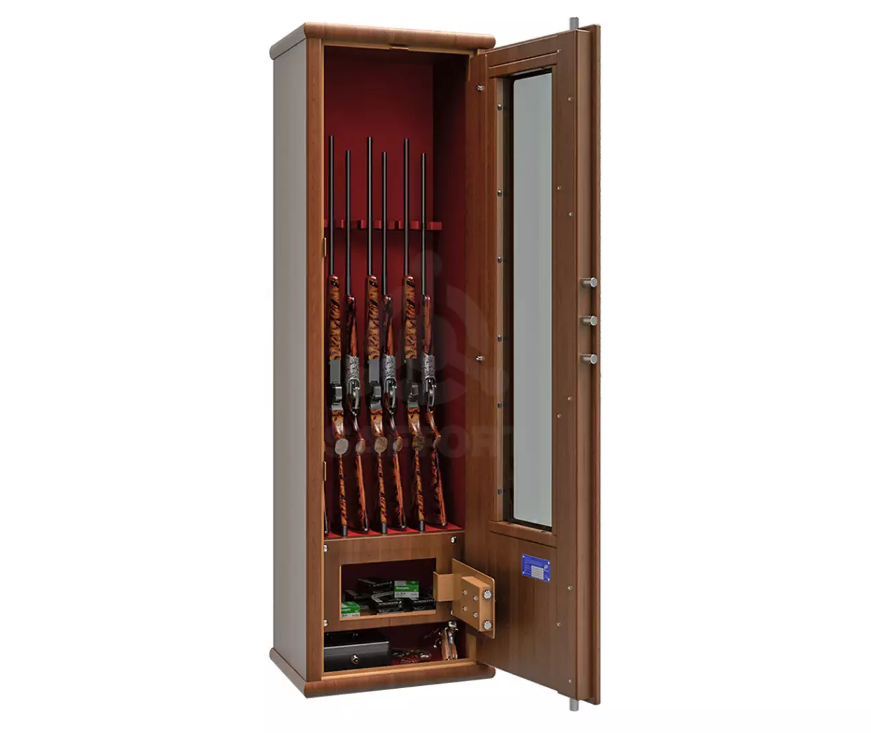 Luksusasekaappi kirsikkapuun väreillä - Aseet ovat näkyvissä turvallisesti ja voit antaa hyvillä mielin vieraiden ihastella kokoelmaa.