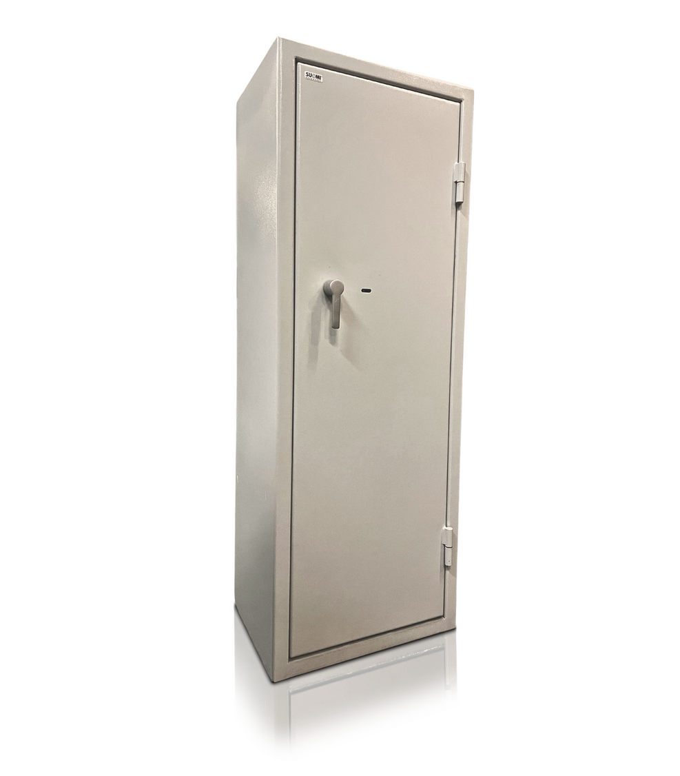 Aselain mukainen sertifioitu raskas asekaappi jopa 16 aseelle. Vaalean harmaa.