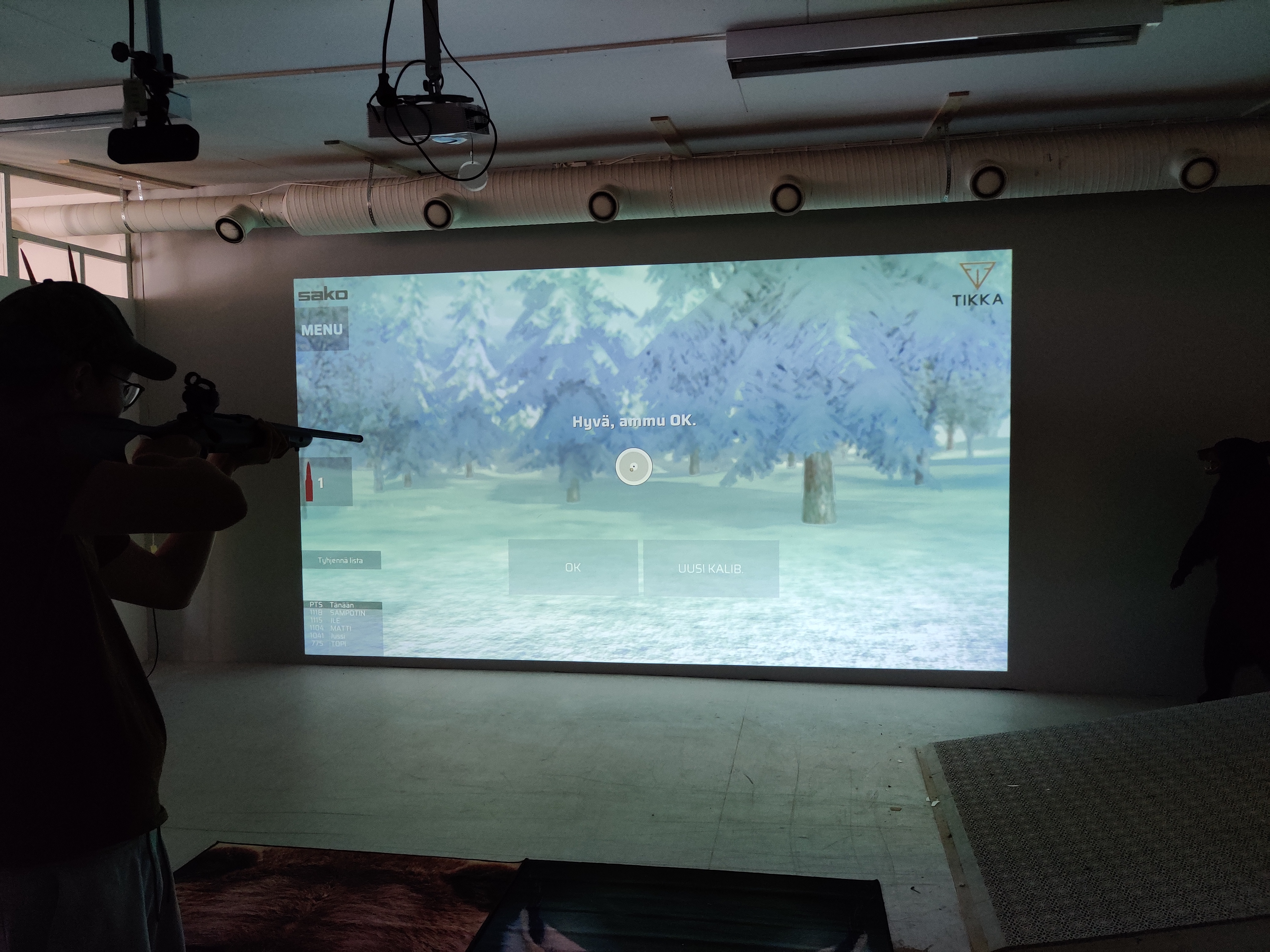 Eräsuomi Oy:n metsästys- ja rata-ammuntasimulaattori sijaitsee myymälän yläkerrassa olevassa huoneessa, jossa asiakas saa rauhassa harjoittaa valitsemaansa ampumasimulaatio muotoa.