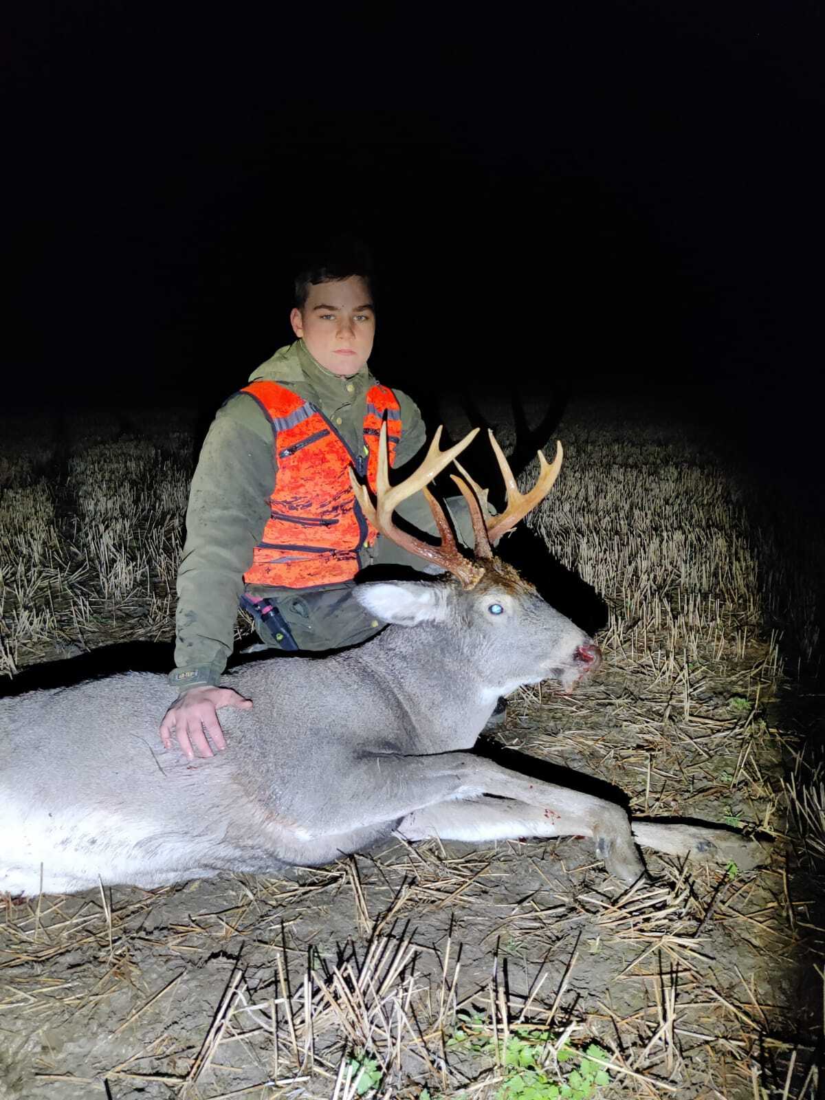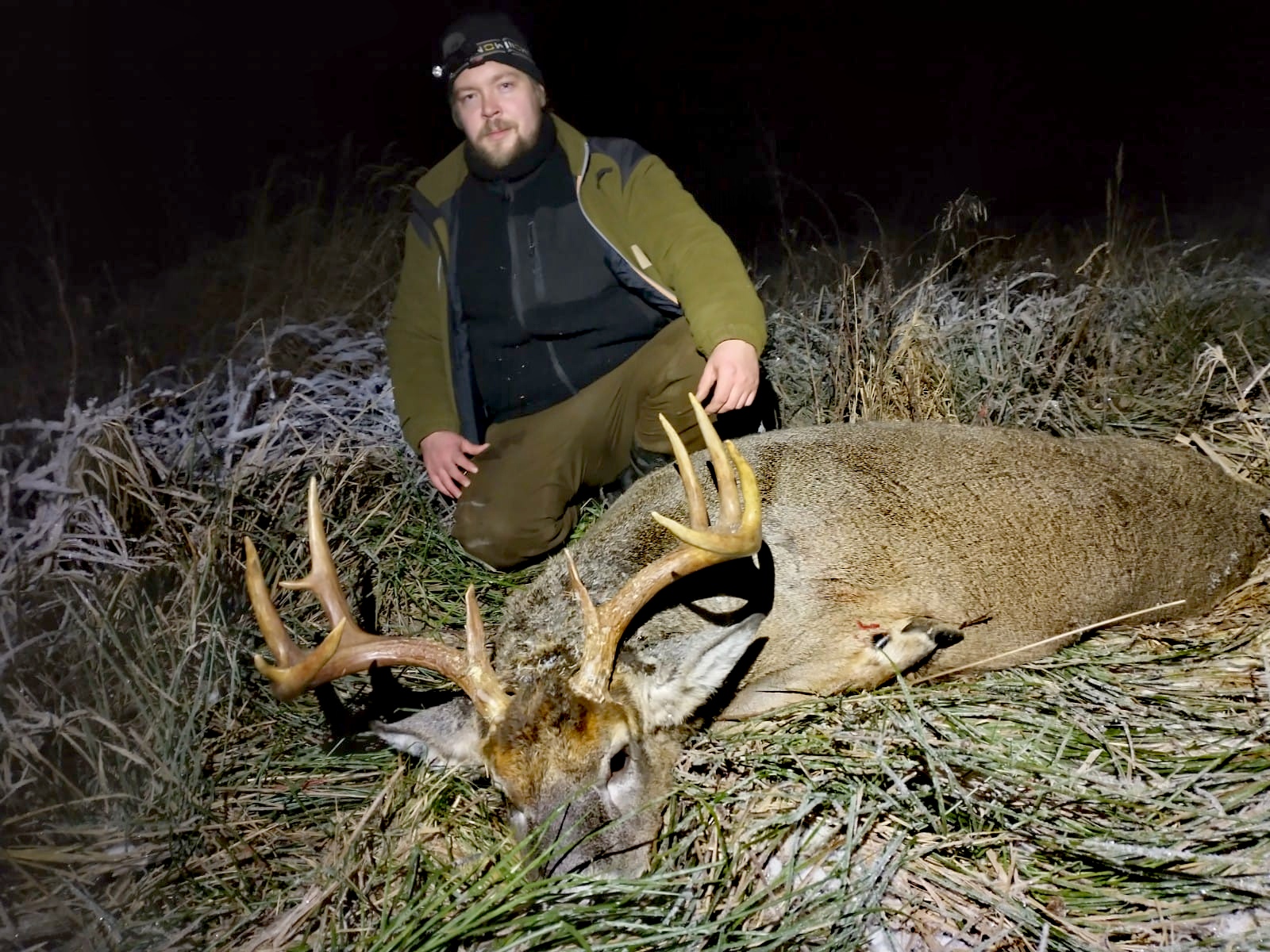 "Lähdin kyttäämään ilta yhdeksän jälkeen. Keli oli tyyni ja maa oli sula. Peuroja näin useampia jo mennessä kyttäyspaikalle. Hiippailin rauhassa koppiin ja laitoin aseen valmiiksi. Aloin tarkastella edessä olevaa peltoaluetta burrelin NV-400 pimeänäkölaitteella ja havaitsin noin 100 metrin päässä isokokoisen sarvipään. Aseessa oli kiinni Fenixin TK32-valo, jolla näin kohteen hyvin. Peura oli hyvin kylkilinjassa ja yksi laukaus riitti. Kyseinen peura on esiintynyt useasti riistakameran kuvissa."