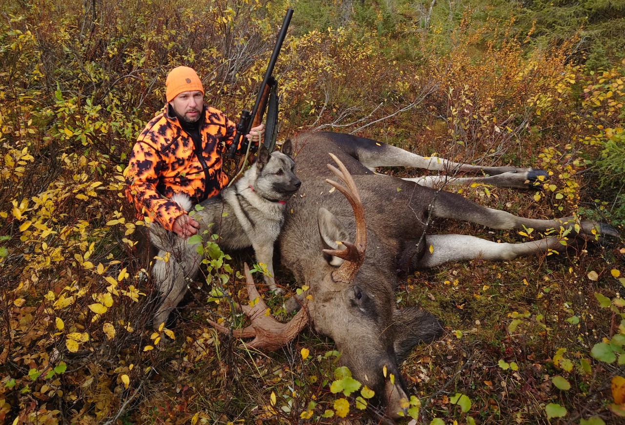 Pääsin hyvin hiippailemaan kuivaa kangasta haukulle, olin koiraan ja hirveen nähden ylhäällä rinteessä joten hirvi ei aavistanut mitä tuleman pitää.