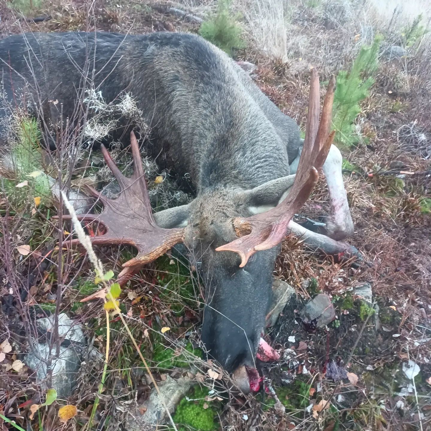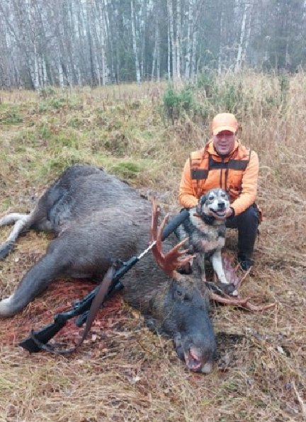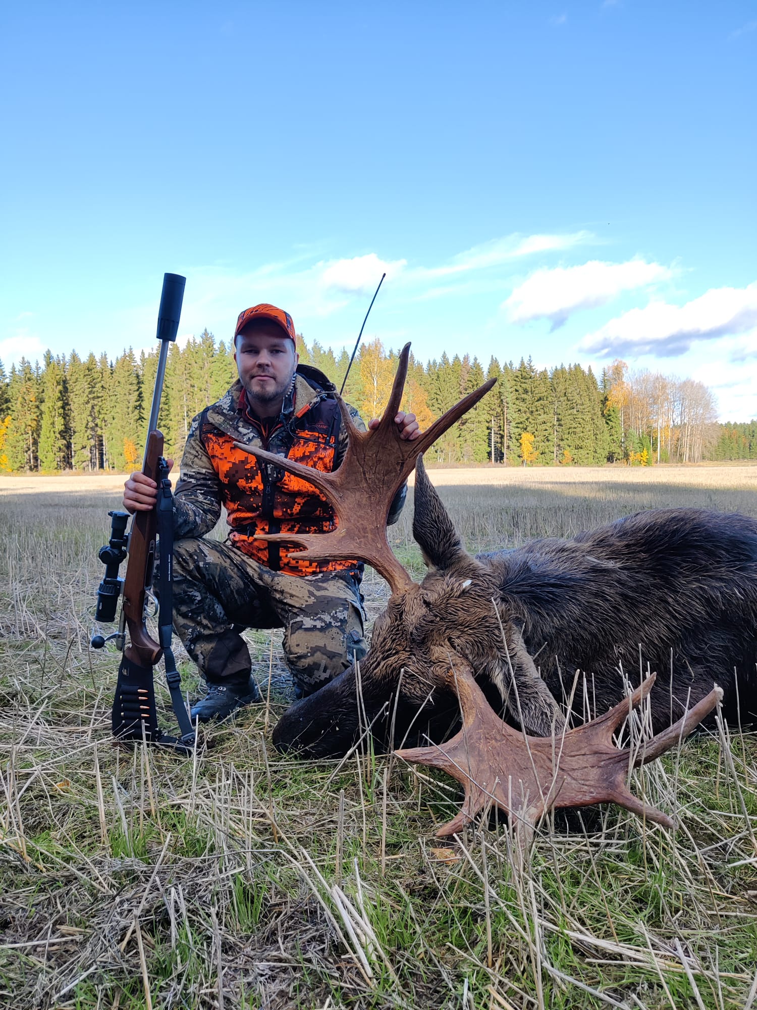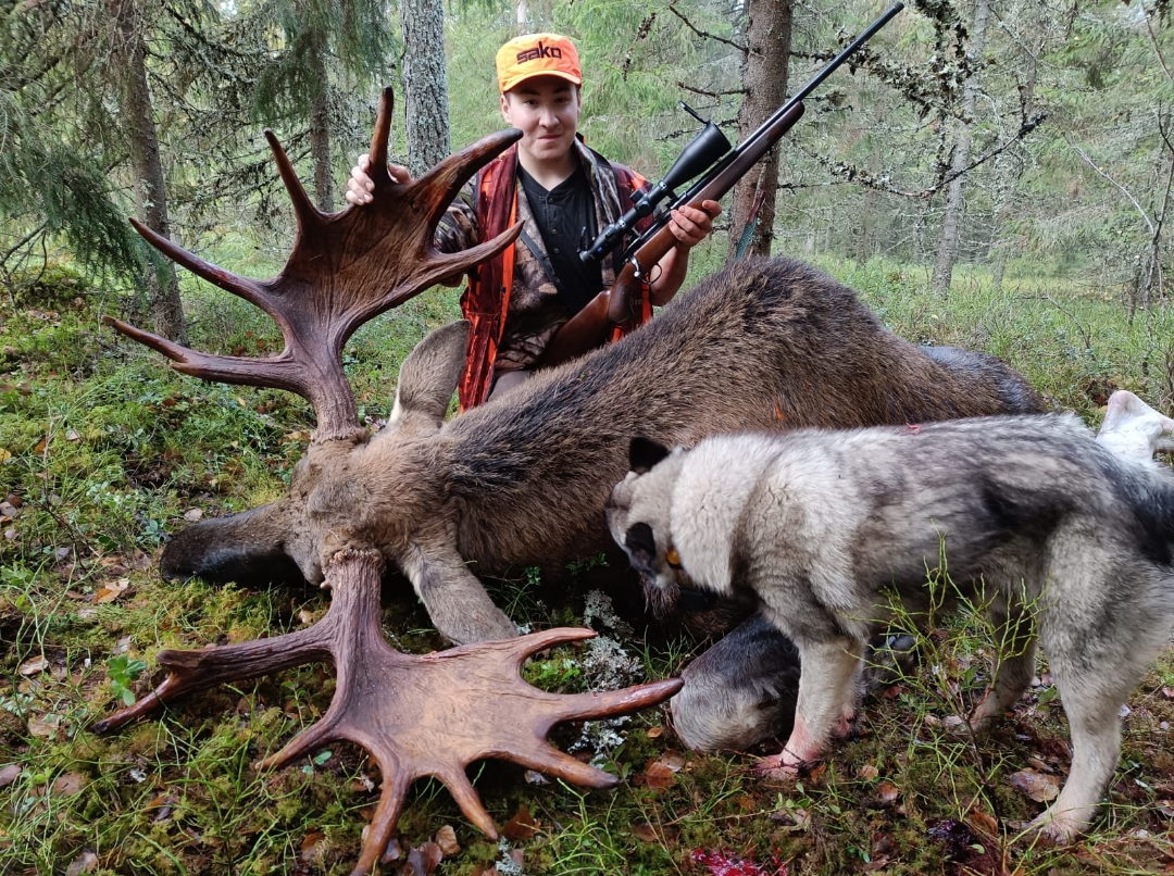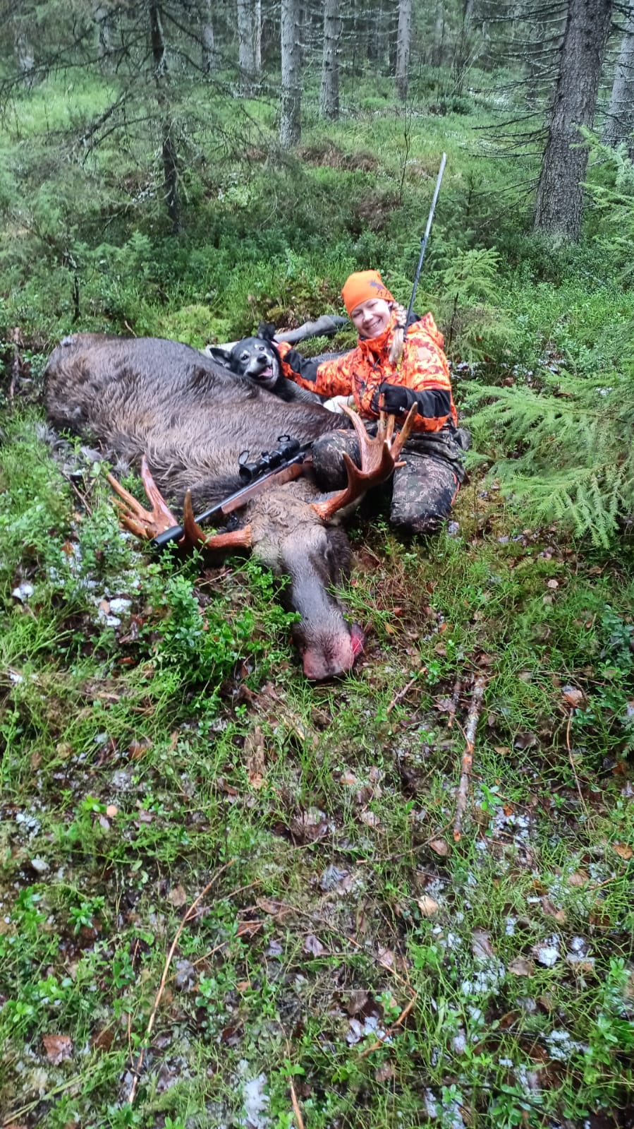 Omat koirat ajoi hirven jokeen ja lopettivat siihen, päätin mennä veneellä Ounasjokea alaspäin, moottori ei käynnistyny.. termos valui taskussa housut märiksi.. no päätin soutaa alajokea tunnettuun ylikulkupaikkaan passiin, ehdin olla noin 30 min ku kaveri ilmoitti että iso hirvi menny Rovaniemen tien yli,ei tietoa mikä hirvi ,, koiran panta ei paikantanu 5 minuuttiin ku meni joen yli, siitä kesti 15 minuuttia ku hirvi tuli joen ylikulkupaikalle missä olin passis , ammuin ensimmäiseen rakoon ja hirvi pysähtyi tiehän kuusen taakse, ammuin uudestaan ja hirvi lähti ku ohjus takaisin tulosuuntaan, sain vielä mahdollisuuden kun se kääntyi avonaiseen paikkaan ja ammuin niskaan ja hirvi kumoon!