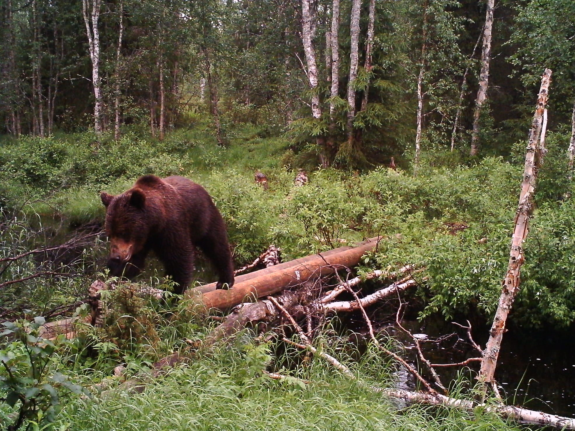 Saate: Metsäpalstalla olevalle pienelle joelle tehtiin muutamista puista silta että siitä pääsee kävellen yli. Majava oli vieraillut paikalla jo keväällä ja kamera asetettiin vahtimaan siltaa että tiedetään jos lättähäntä alkaa tekemään tuhojaan.