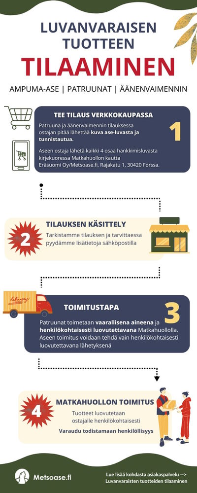 Ostaminen verkkokaupastamme on helppoa ja nopeaa. Kun löydät tuotteen jonka haluat ostaa klikkaat vain "LISÄÄ OSTOSKORIIN" –painiketta ja tuote siirtyy ostoskoriin. Ostoskorin sisältöineen näet sivun ylälaidassa oikealla olevasta pudotusvalikosta. Voit jatkaa tuotteiden etsiskelyä ja lisätä niitä aina halutessasi ostoskoriin.
