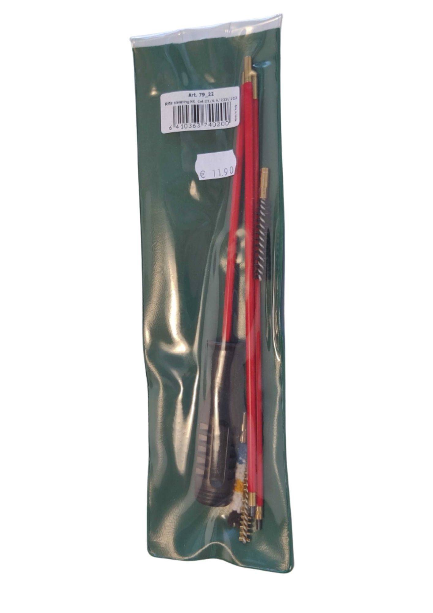 Pienoiskiväärin puhdistussarja. Kumitettu puikko, 3 harjaa ja säilytyspussi. Kaliiperi 22.
