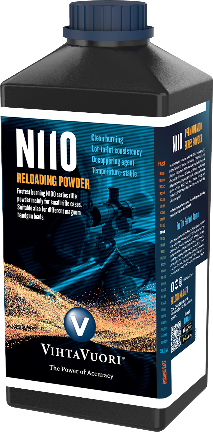 Vihtavuori N110 -jälleenlatausruuti 1 kg:n pakkauksessa. Vihtavuori -jälleenlatausruudit ovat puhtaasti palavia, lämpötilastabiileja ja tasalaatuisia.