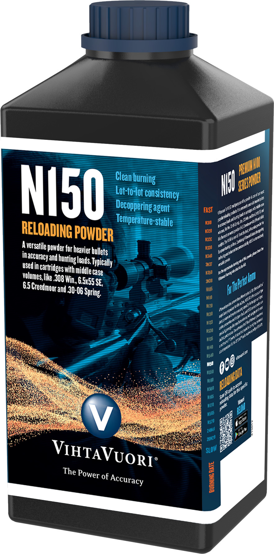 Vihtavuori N150 on suhteellisen hidaspaloinen ruuti, joka sopii tavallisimpiin keskikokoisiin patruunoihin, kun sitä käytetään raskaampien luotien kanssa tarkkuus- ja metsästyslatauksissa. Erinomainen valinta 6.5x55 SE, 6,5 Creedmoor, .308Win, ja .30-06 latauksiin. N150 tarjoaa käyttäjälleen myös lämpötilaepäherkkyyttä, joten voit käyttää sitä hyvin monissa olosuhteissa sekä erityisesti pitkän matkan ammunnassa.