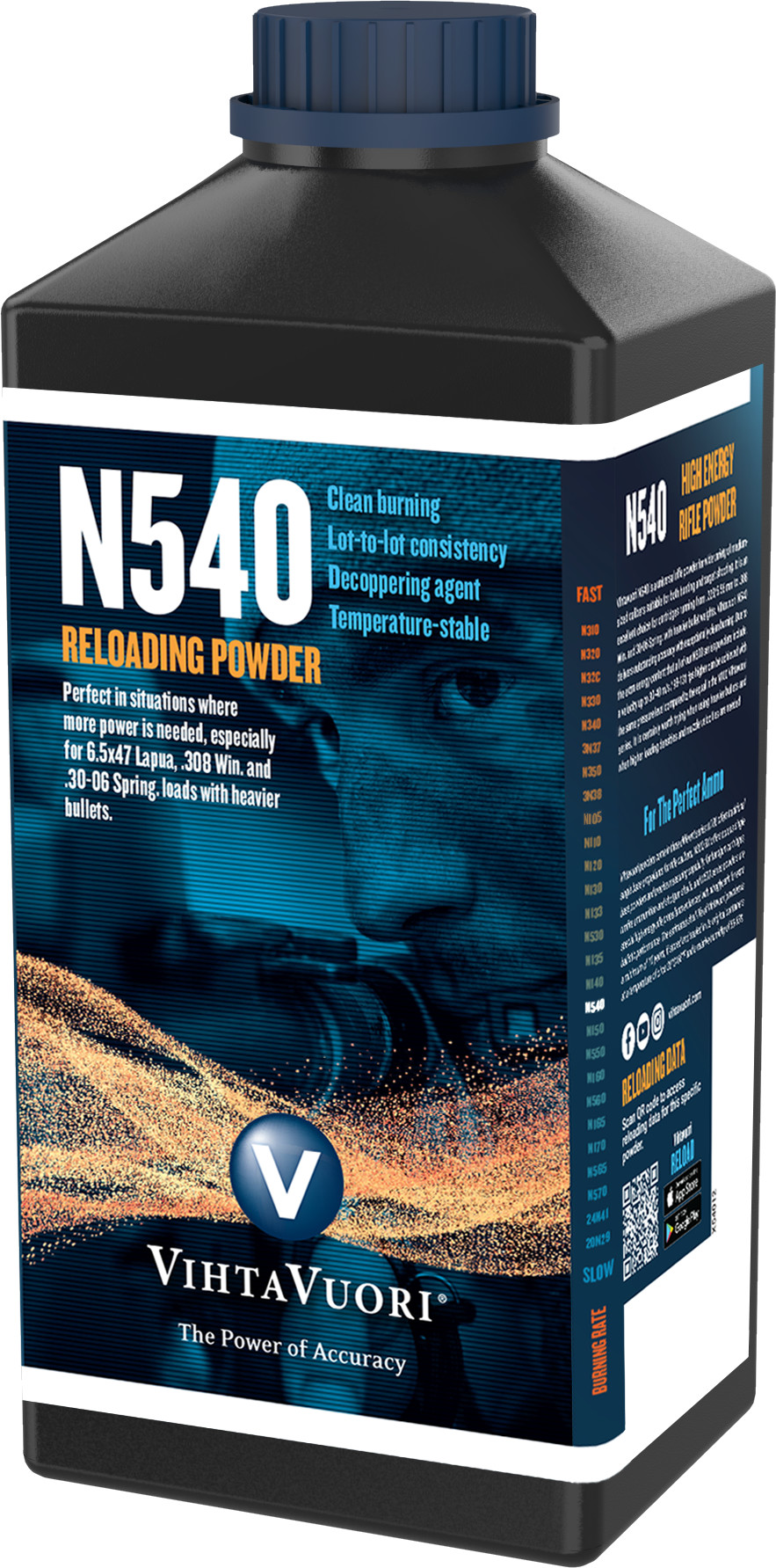 Vihtavuori N540 -jälleenlatausruuti 1 kg:n pakkauksessa. Vihtavuori -jälleenlatausruudit ovat puhtaasti palavia, lämpötilastabiileja ja tasalaatuisia.