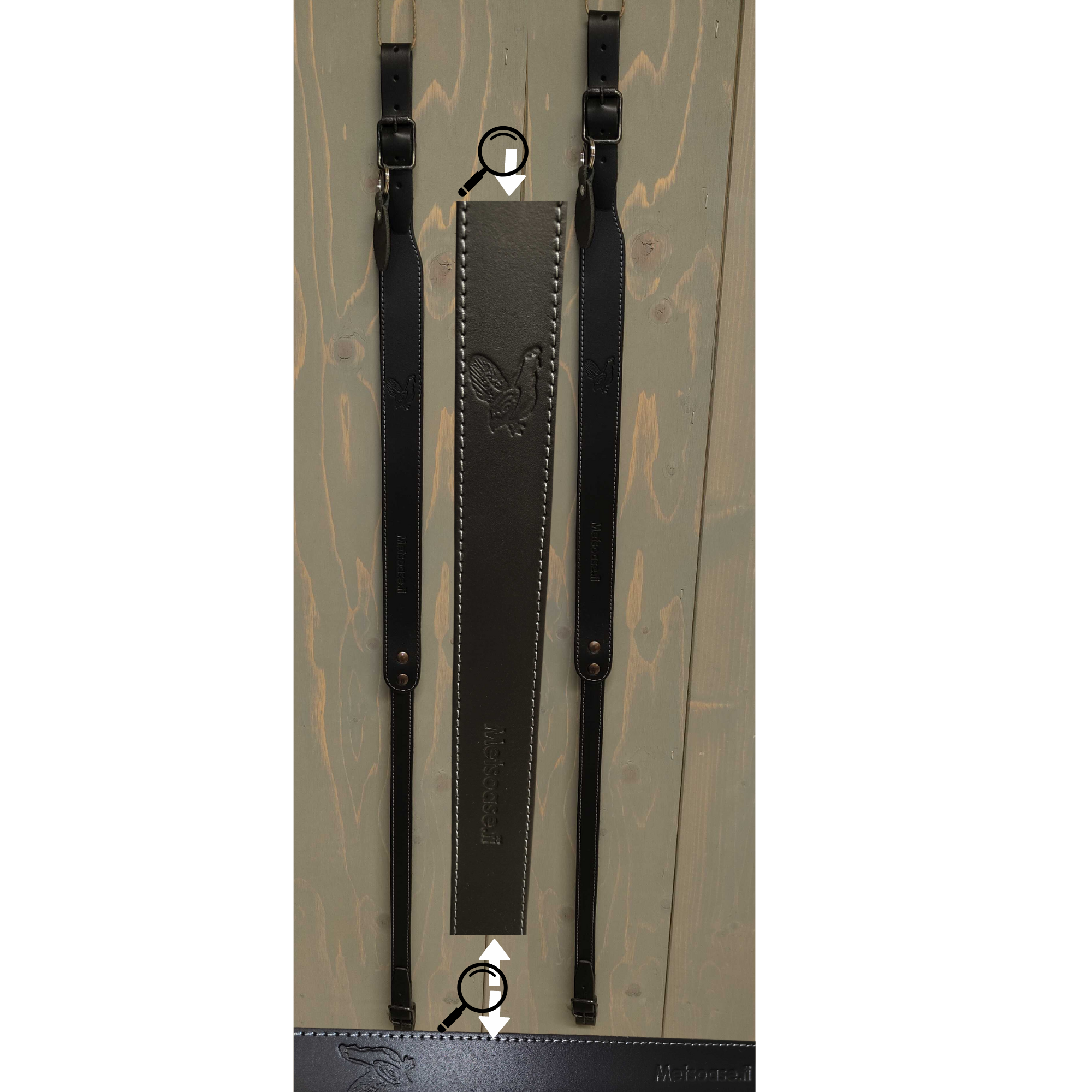 Musta ja laadukas nahkainen asehihna. Asehihnassa on somisteena pieni metso-kirjailu. Hihnan säätövara on välillä 94-105 cm.