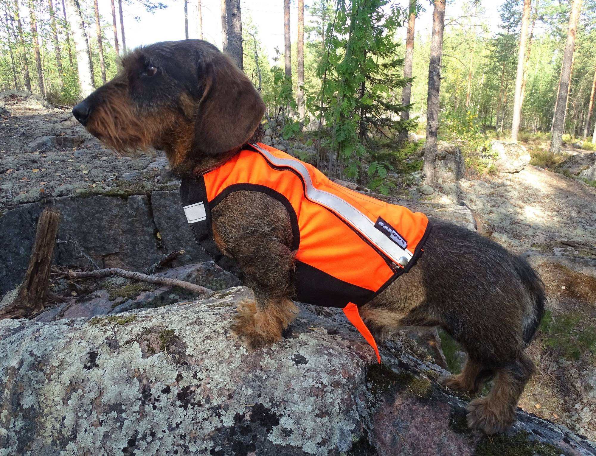 Hengittävä ja vedenpitävä asu metsästyskoirallesi. Kun liivi on sopivan kokoinen ei lumi pääse talvella kerääntymään helposti liivin sisään. Rintakehä suojaantuu koiralla hyvin, koska liivin rintaosa on leveä ja materiaalit kestäviä.