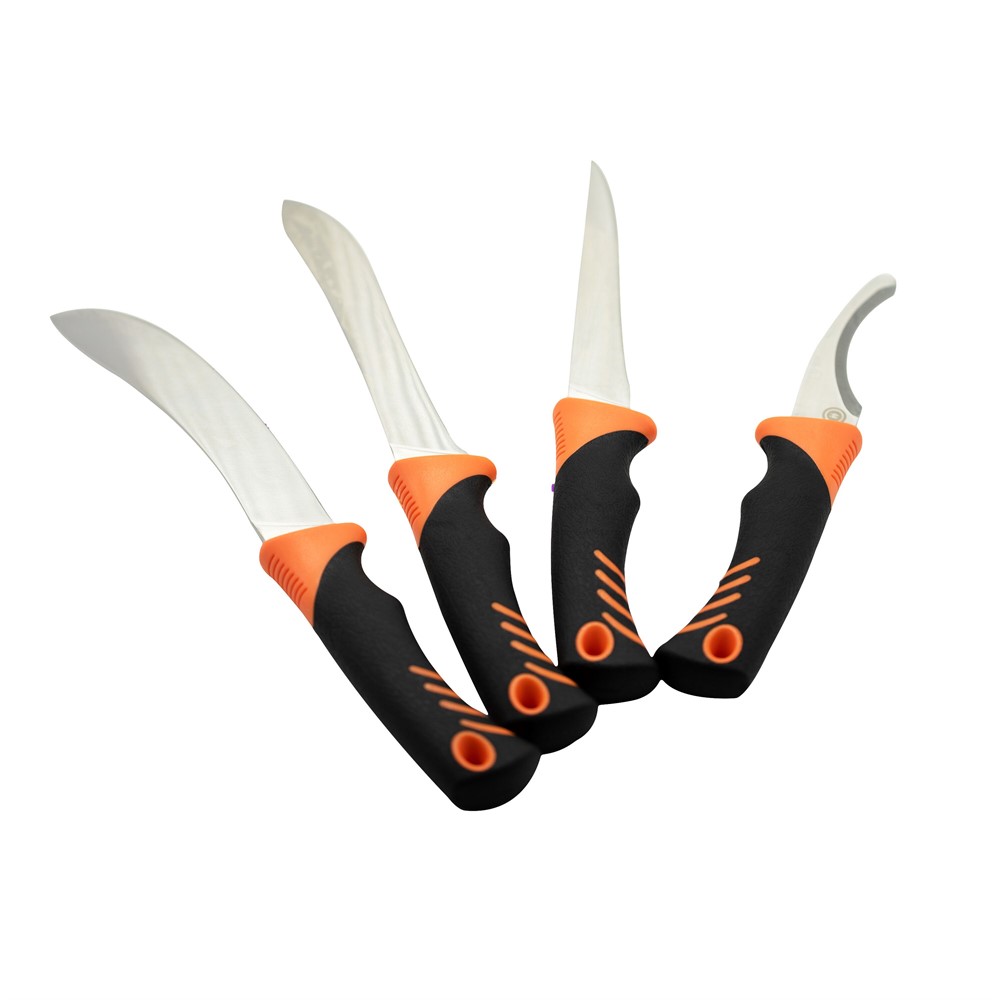 - Veitsien kumikahva tarjoaa pitävän ja tukevan otteen työskennellessä, vaikka se olisi märkä tai verinen.