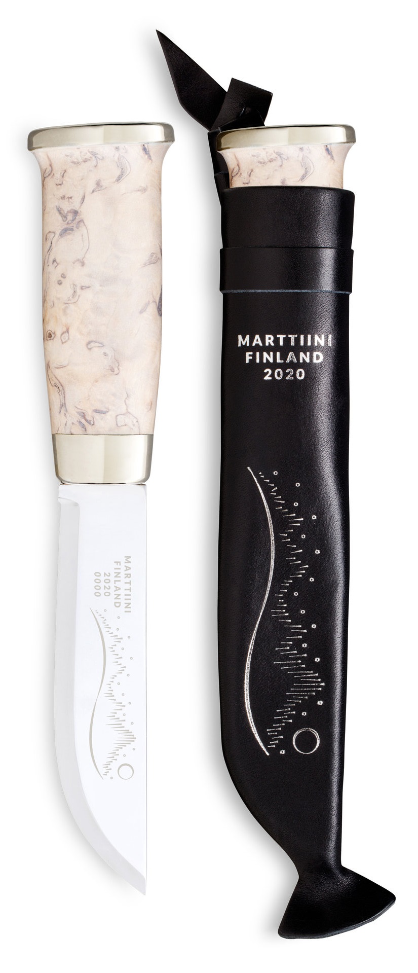 Puukon valkeaksi vahatusta visakoivusta tehty kahva, krominkirkas terä ja musta nahkatuppi toistavat pohjoisen talviyön vastakohtia. Puukon terän malli on klassinen lapinleuku. Komea ja korumainen puukko on hyvä, käytännöllinen lahja suomalaisen designin ystävälle.