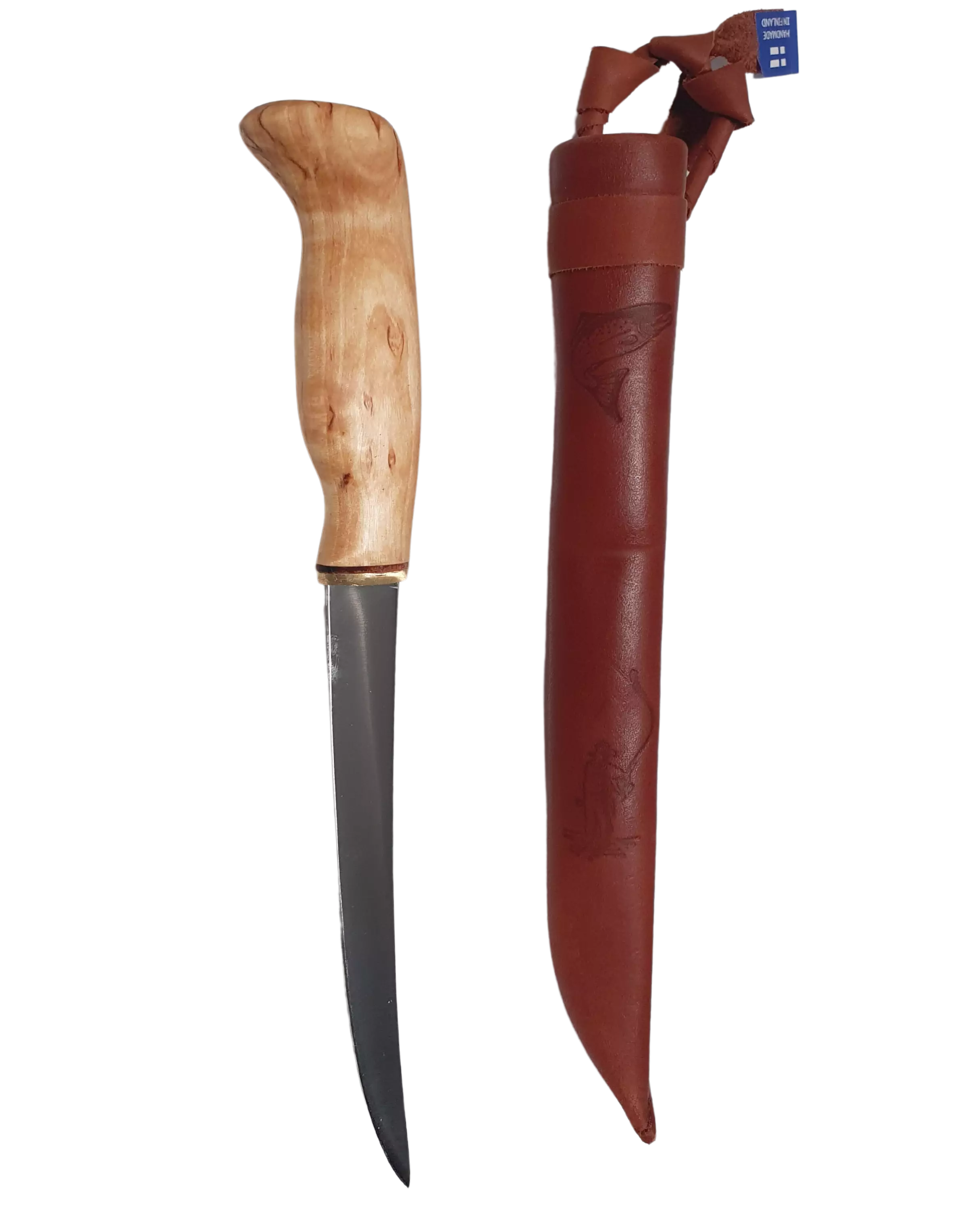 Ruostumattomasta teräksestä ja visakoivusta valmistettu fileerausveitsi. Terä pituus on 16 cm ja kahva on visakoivua. Puukon tuppi on valmistettu ruskeasta nahasta, jossa on lohen kuva.