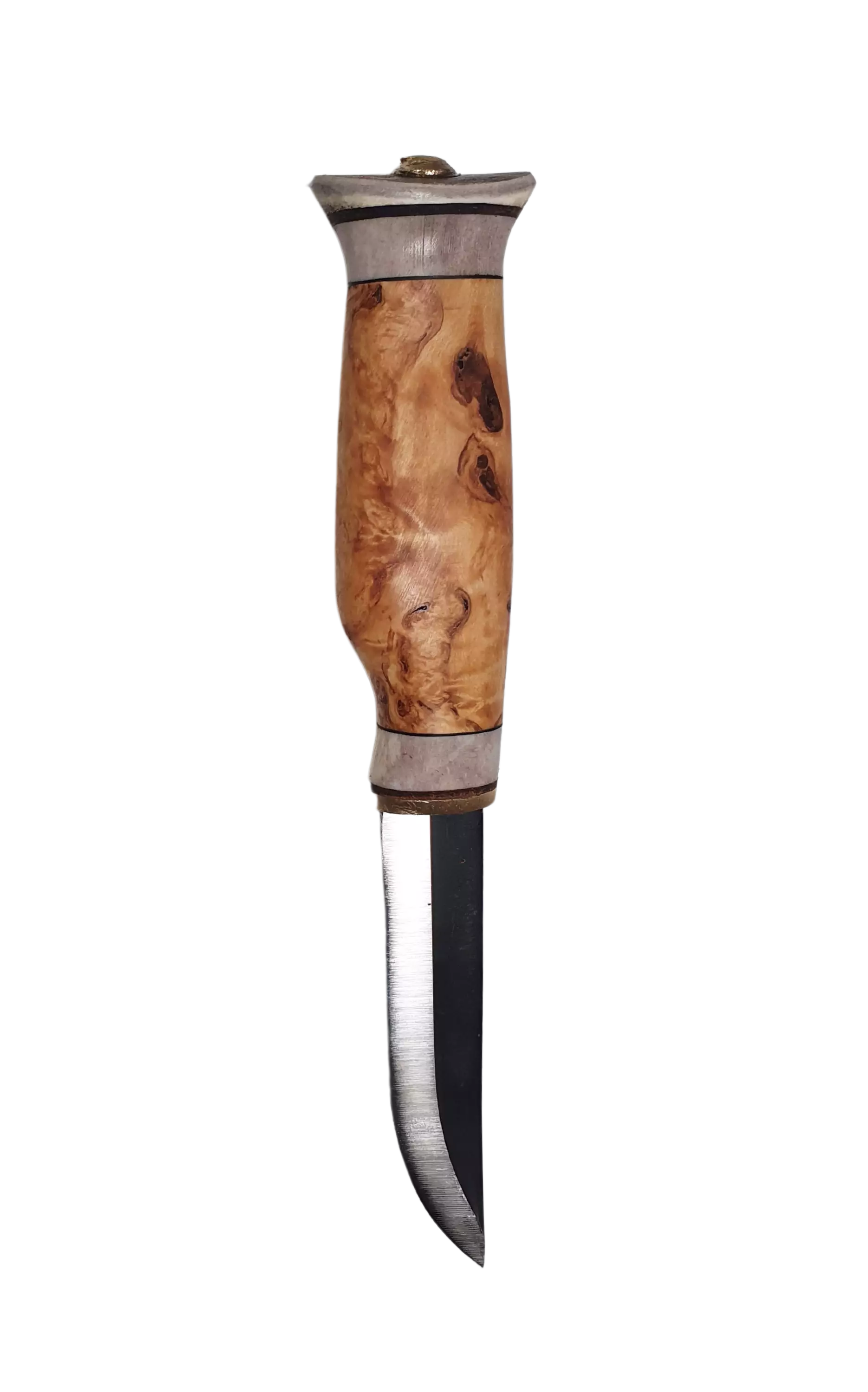 Vuolupuukko 9,5 cm terällä. Kahva on valmistettu poronsarvesta ja visakoivusta.